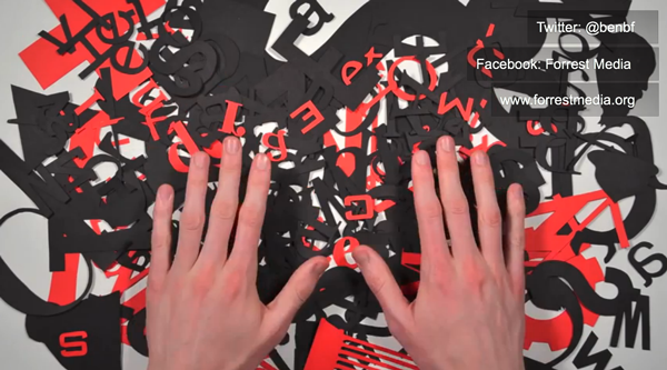 This charming and informative overview of type from Gutenberg to the computer uses letterforms meticulously cut from red, black and white paper. A pair of hands introduces the type, moves it into place, then whisks it offscreen. Truly a labor of love.