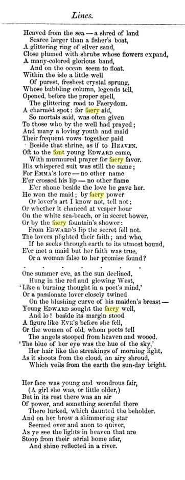 The poem is a syrupy paean to the chaste, wholesome love of “Edward” for “Emma,” as contrasted with the seductive lure of a faery woman. Kind of a raw deal for the faery woman as Edward may have secured Emma’s love by praying at the faery font/shrine. Overtly sexual women don’t deserve love, clearly. Whatever. I’ll be over here with my Good Vibrations variety pack, reading trenchant political commentary and eyeshadow tips in Teen Vogue, and eating Christopher Elbow chocolates.