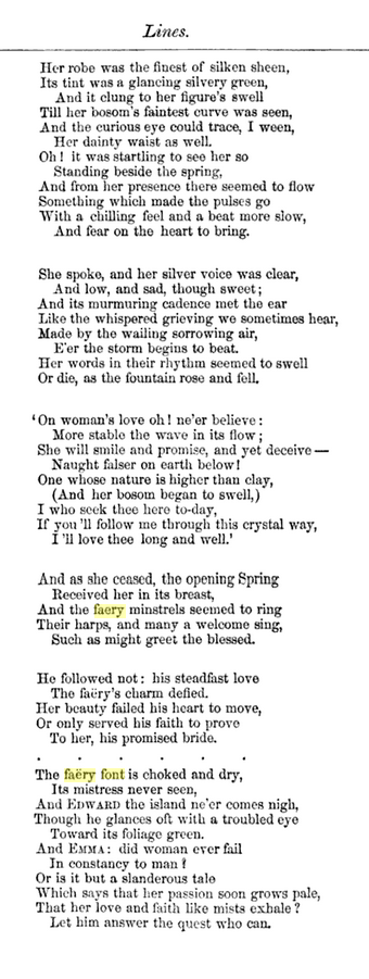 Ok, so this is a total cheat. Today’s Font Friday is “font” as in “fountain”: in this case, a font created and guarded by faeries. I came across the poem when I was looking for font-related words that start with “f,” and I thought it was interesting.