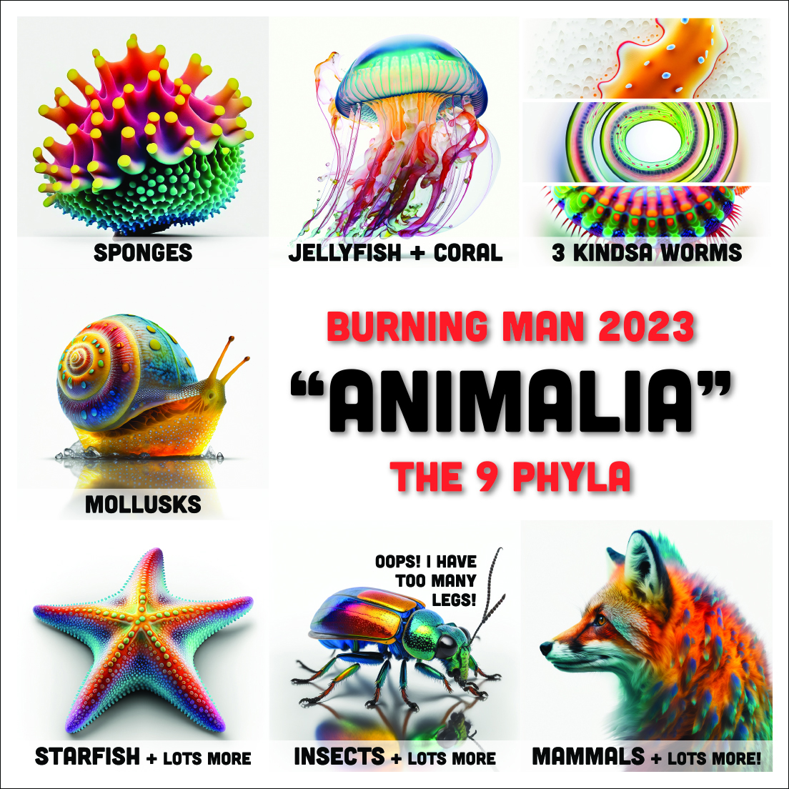 ![Black background. All text is centered. [In bold yellow caps] Burning Man 2023 “Animalia” [in bold bright pink caps] 9 Phyla [in white all lower-case] sponges, jellyfish + corals, 3 kindsa worms, mollusks, starfish + more, insects + more, mammals + more [in bold bright pink caps] 10 Principles [in white all lower-case] radical inclusion, gifting, decommodification, radical self-reliance, radical self-expression, communal effort, civic responsibility, leaving no trace, participation, immediacy](https://www.nicolaginzler.com/wp-content/uploads/2023/05/5-Nicola_Ginzler-sticker-9phyla-10principles-3-1024x1022.png)