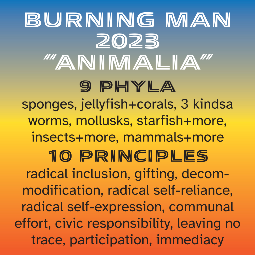 ![The sticker has a vertical background gradient, shading from sky blue at the top, through yellow in the middle, to orange at the bottom. There's text centered over that: [in bold white capitals] Burning Man 2023 “Animalia” [then in black capitals] 9 Phyla [then in black all lower-case] sponges, jellyfish+corals, 3 kindsa worms, mollusks, starfish+more, insects+more, mammals+more [in bold caps] 10 Principles [in all lower case] radical inclusion, gifting, decommodification, radical self-reliance, radical self-expression, communal effort, civic responsibility, leaving no trace, participation, immediacy](https://www.nicolaginzler.com/wp-content/uploads/2023/05/4-Nicola_Ginzler-sticker-9phyla-10principles-1-1024x1024.jpg)