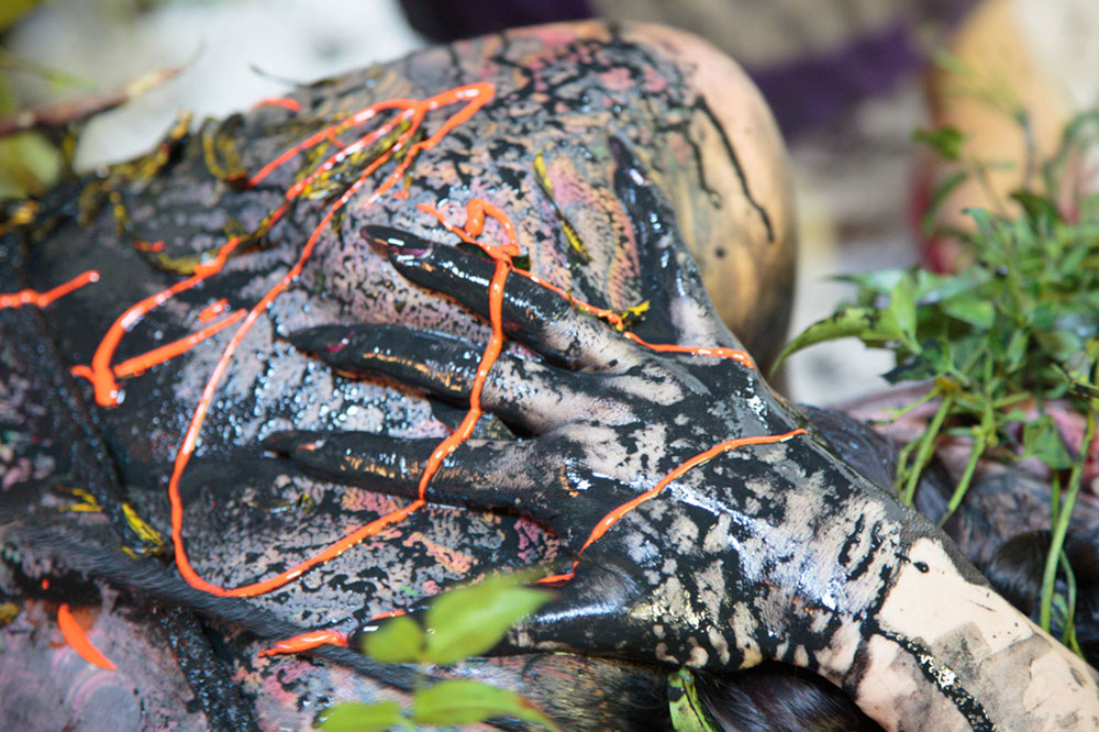 - Paint is smeared on the model, bound with rope and decorated with vegetation.
