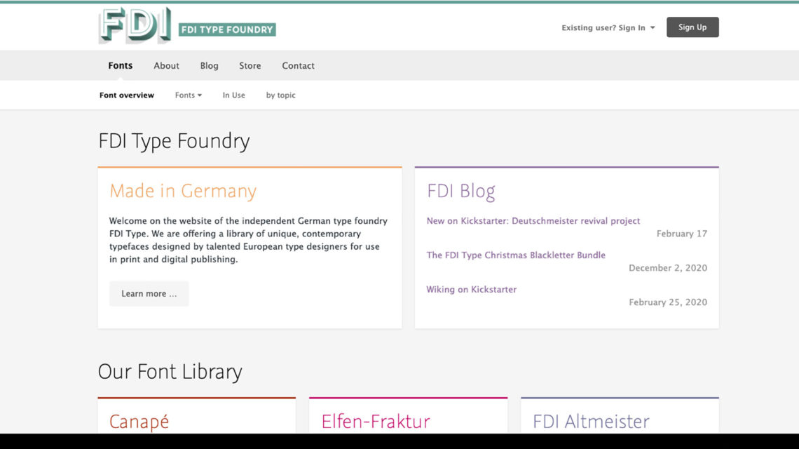 We [offer] a library of unique, contemporary typefaces designed by talented European type designers for use in print and digital publishing. FDI Type was founded in 2004. The name comes from the original web domain “fonts dot info’. Since 2015, the foundry is part of a network of typography websites run by Schriftkontor Ralf Herrmann. Other current projects are Typography.Guru, Typografie.info and Letter Library.