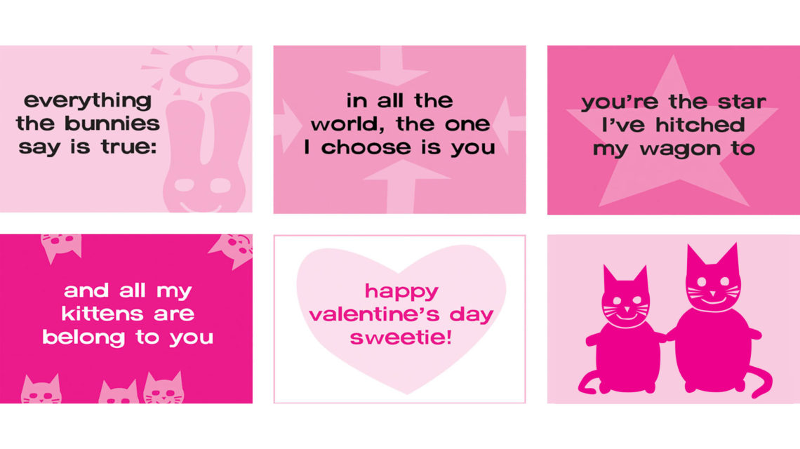 “everything the bunnies say is true / in all the world, the one I choose is you / you’re the star I’ve hitched my wagon to / and all my kittens are belong to you. happy valentine’s day, sweetie!”
