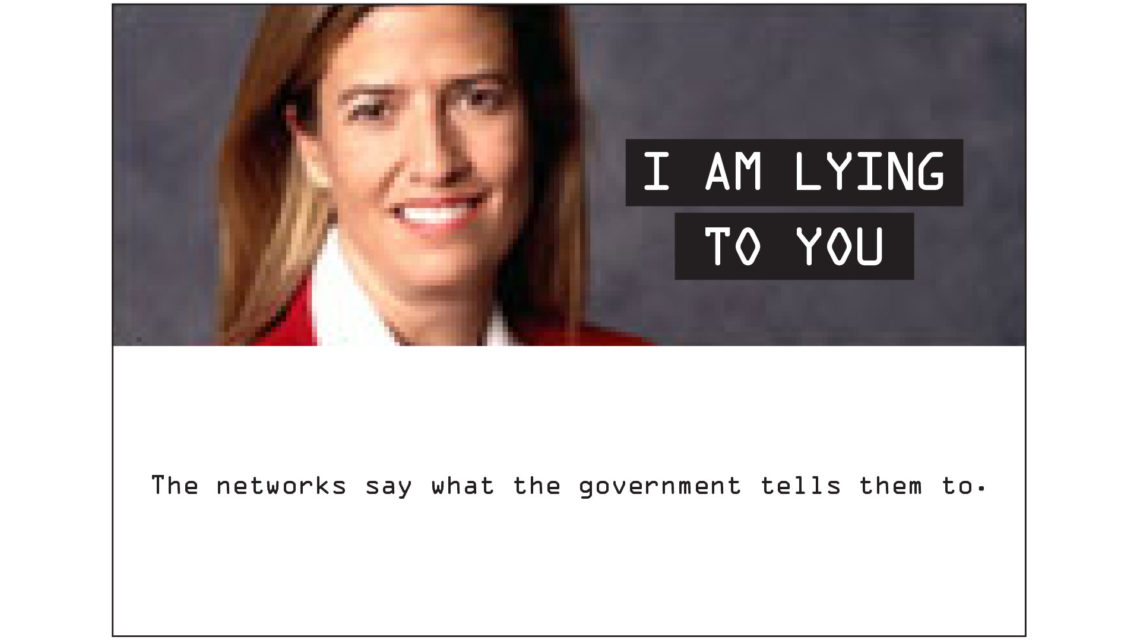 I used screengrabs of then-popular newscasters superimposed with the “I Am Lying To You” headline to attach guilt and responsibility directly to the most common TV news faces; I wanted viewers to remember the slogan every time they watched the news.