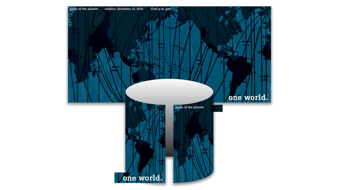 It was a hopeful holiday greeting to remind the recipients that we are all connected. The artwork has many layers in Photoshop: the paths of the planets on the solstice, the shapes of the continents, and overlapping whorls of color. The card was cropped in to the hard edge and shipped flat. When you bent the card around on itself, following an included diagram, the continents lined up to make One World.