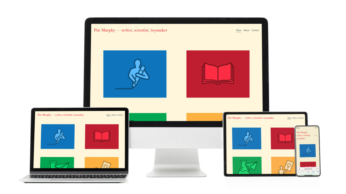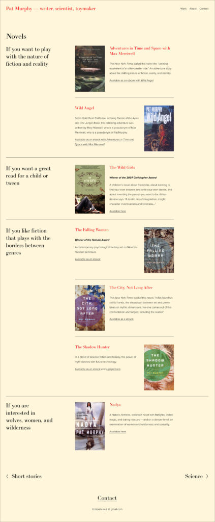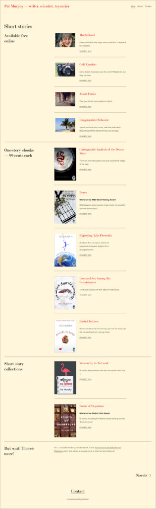 Pat needed a website that reflected all these aspects of herself, and that acted as an information center for her substantial body of work. She also needed links to booksellers for each item. And she wanted to be able to add new content herself.