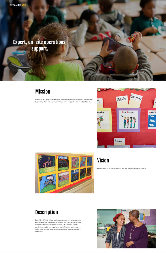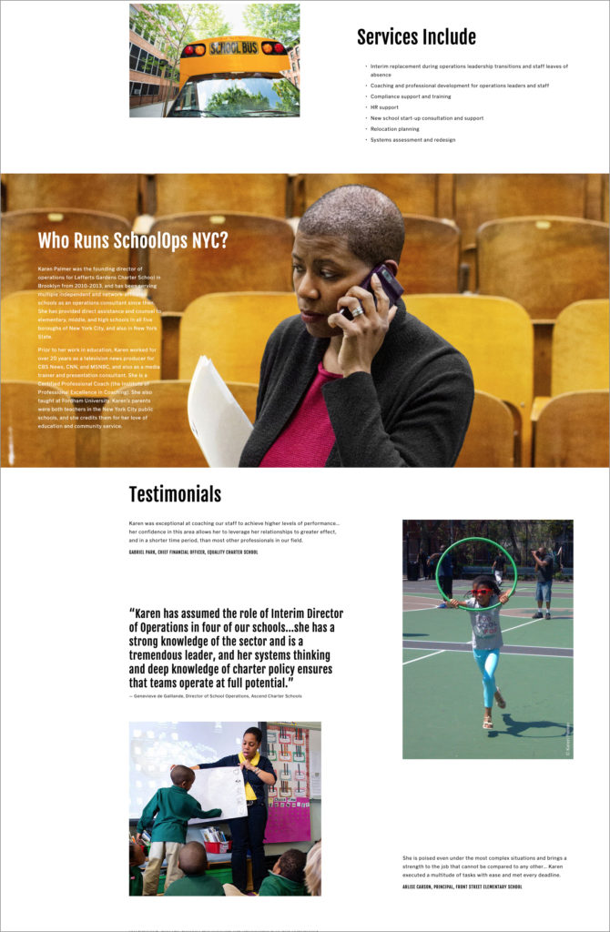 To keep things simple, we decided on a one-page website with several different sections. Using the Squarespace platform, I used stock and custom photos to give the feel of exuberant classrooms and a well-functioning school, and Karen supplied me with carefully honed copy. Testimonials, a contact form and a newsletter signup link rounded out the site.