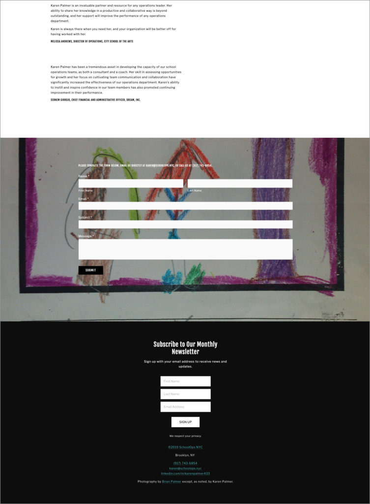 Karen needed a straightforward, eye-catching logo and website to promote her business. She works largely with schools serving children of color, and wanted photos reflecting that demographic. She also wanted to offer signups to her newsletter.